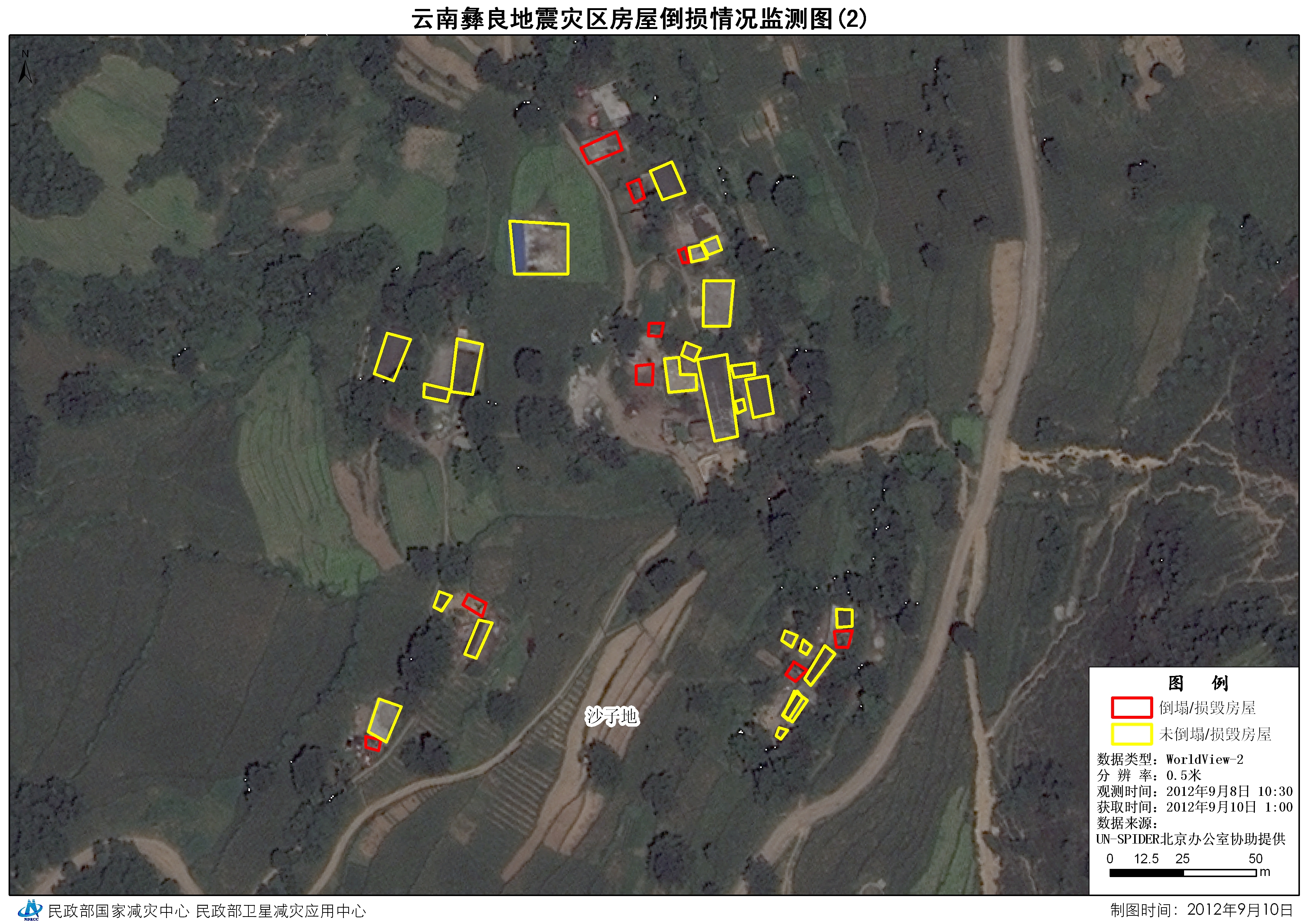 Upon request from the National Disaster Reduction Centre of China (NDRCC), UNOOSA/UN-SPIDER immediately placed a request to the National Remote Sensing Centre (NRSC) of Indian Space Research Organisation (ISRO) and DigitalGlobe to task high resolution satellite imagery collection of the earthquake-hit area. The prompt action of UN-SPIDER helped ISRO and DigitalGlobe to plan tasking on the same day (7th September 2012) and collect the images on the following day, 8th September 2012.