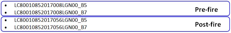 • The folder containing post-fire images (for this procedure, the Landsat 8 images name used for pre fire is LC80010852017056LGN00);