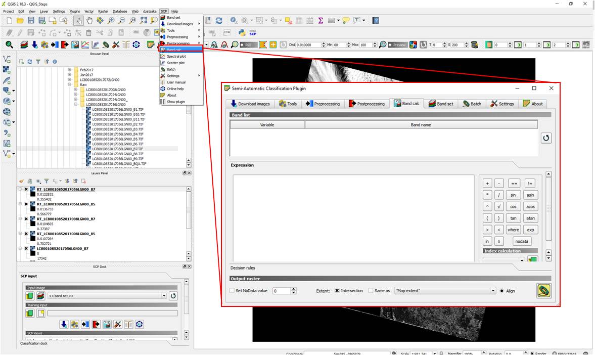 In order to calculate NBR in QGIS, the tool Band Calc will be used. So please go to SCP -> Band Calc. After selecting the Band Calc tool, it should open a new window, as indicated by the red box in Figure 13.