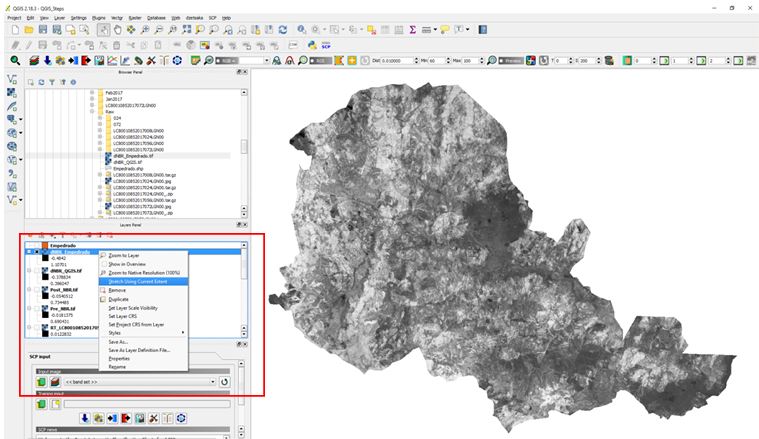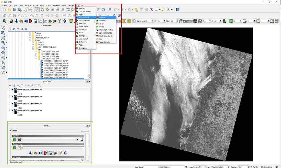 So now there should be SCP icon on your menu toolbar. Please go to SCP -> Preprocessing -> Landsat, as demonstrated in the red box in Figure 8. You can see that after the plugin has been installed, a new window could open on the bottom left corner, indicated in green in Figure 7. The SCP dock provides a quick access to some of the SCP plugin’s functions.