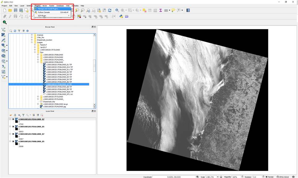 To correct for the TOA in QGIS, the Semi Automatic Classification plugin is used. So before correcting, please be sure that you have the plugin installed. To install it, please go to Plugins -> Manage and install plugins… (Figure 5).