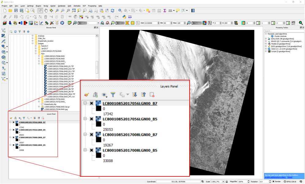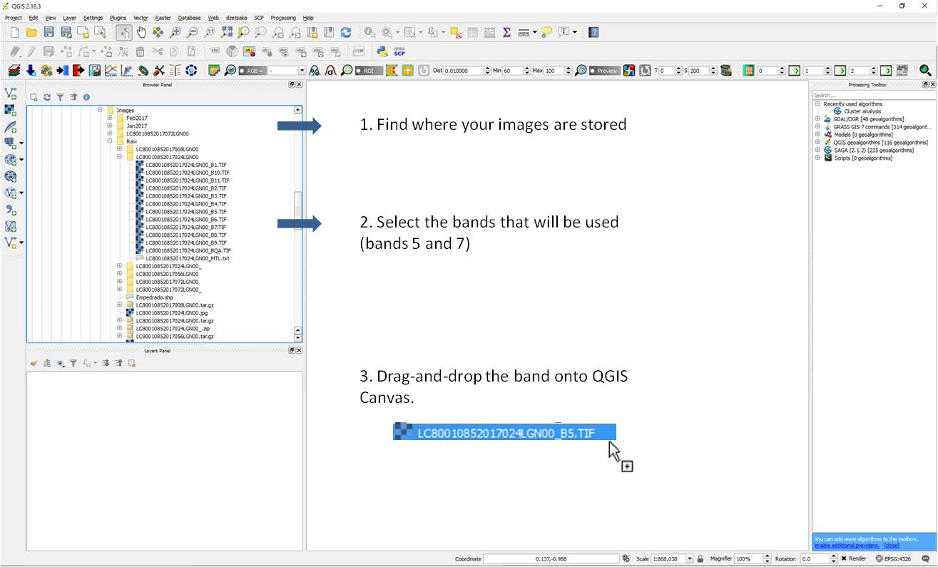Please find where you have stored your images, select the bands that are going to be used for NBR. Once each layer has been selected, double-click it to add it to the Map Canvas or you can also drag-and-drop the layer to the Map Canvas (Figure 2).