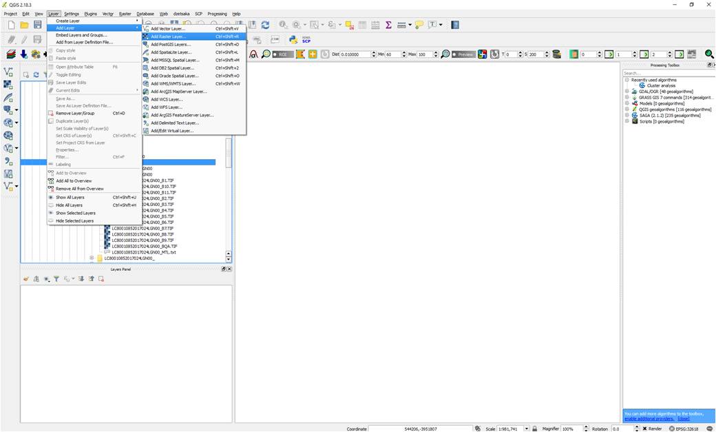 To open the images using the menu toolbar, please click on Layer -> Add Layer -> Add Raster Layer (Figure 3). This should open a window where you can find the folder where the bands are stored. When you find them, select and click open for each of the bands.