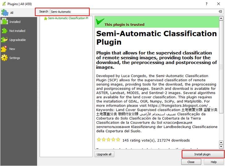 After clicking on Manage and Install Plugins… a new window should open where you can search for plugins to be installed. Please type on the search box 'Semi-Automatic'; after typing it should automatically show you the plugins options that correspond to the search (Figure 6). After selecting the Semi-Automatic Classification (SCP) Plugin, please click install on the bottom right corner of the window (indicated by the red box in Figure 6).