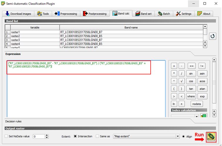 Open the Band Calc tool again (SCP -> Band Calc) and click the refresh list icon again, so the new calculated files will also appear. Remove the previous expression and insert the following one: