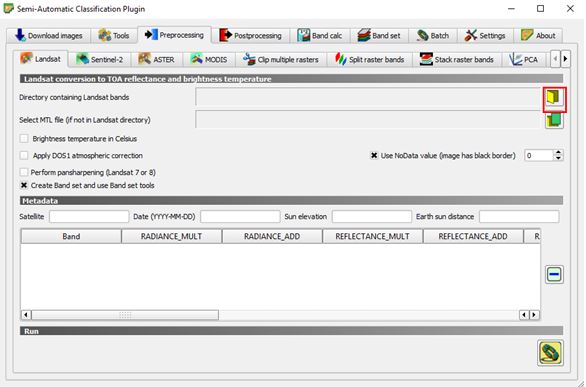 After following the path and clicking Landsat, a new window should open, such as the one shown in Figure 8. Click on the yellow icon indicated by a red box in Figure 8 to select the folder where your images and metadata are. It is important that the folder structure remains the same as downloaded because the plugin will automatically use the correspondent metadata.