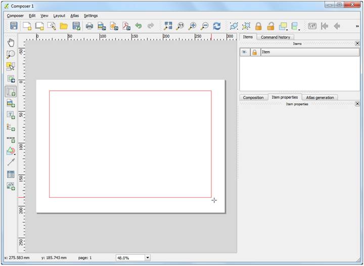 • In the menu toolbar, go to Project -> New Print Composer and assign a name to your project. This will open a white canvas.
