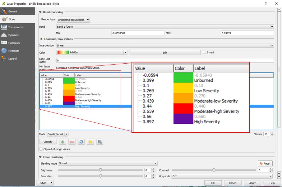 Make sure that the Enhanced Regrowth, high (-2) class and High Severity class (4) are extended to fully cover the values of the scene studied.