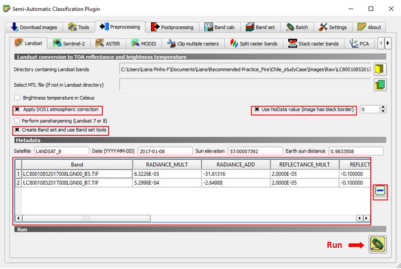 After selecting the folder that contains the pre-fire images, you should see your folder path on the 'Directory containing Landsat bands'. The bands that are in the selected folder are shown (red box in Figure 9) You should also see the metadata automatically loaded, showing the satellite, image date, sun elevation and Earth sun distance (top of the red box in Figure 9).