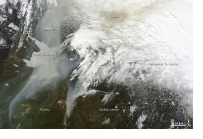 On May 16, 2011, tan and gray smoke spread hundreds of kilometers across Alberta, Saskatchewan, and the Northwest Territories in Canada. At 10:00 a.m., the Alberta government reported 116 fires burning in the province, 34 of them out of control. The following day, the total number of fires had dropped to 100, and the number of uncontrolled fires had dropped to 22. But four new fires had started to burn out of control.