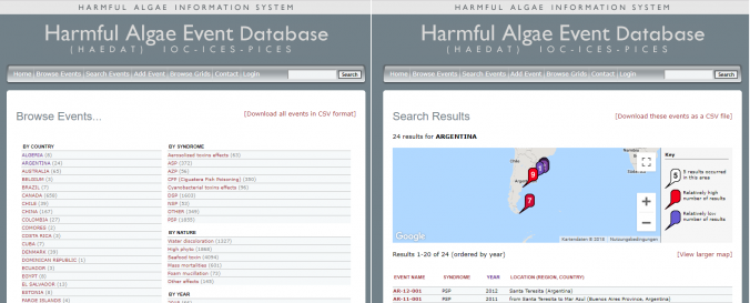 | Space-based Information: | The Harmful Algal Information System, HAIS, will when fully established consist of access to information on harmful algal events, harmful algae monitoring and management systems worldwide, current use of taxonomic names of harmful algae, and information on biogeography of harmful algal species. Supplementary components are an expert directory and a bibliography. The HAIS System is being built within the "International Oceanographic Data and Information Exchange" (IODE) of the "Intergovernmental Oceanographic Commission" (IOC) of UNESCO, and in cooperation with WoRMS, ICES, PICES, IAEA and ISSHA. HAEDAT Disclaimer: The HAEDAT database contains information based on yearly national reports by ICES and PICES member states. The available information on individual events varies greatly from event to event or country to country. Monitoring intensity, number of monitoring stations, number of samplings, stations, etc. also varies greatly and therefore there is not a direct proportionality between recorded events and actual occurrences of e.g. toxicity in a given region. |