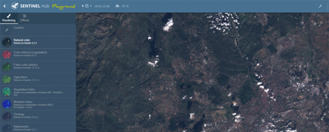 | Space-based Information: | The Sentinel Hub Playground provides a web GIS to explore satellite imagery from platorms Sentinel-2, Landsat-8 and MODIS. Sentinel and Landsat data can be displayed in a variety of predefined band combinations and spectral indices as they are generated on the fly. Costom band combination can be created by the user. Effects like atmospheric correction or color properties such as gain and gamma are adjustable. Filters allow for a selection of imagery by date of image acquisition and percent cloud cover. The Playground further includes a global digital elevation model. Downloading imagery is free but requires an EO Browser account. |