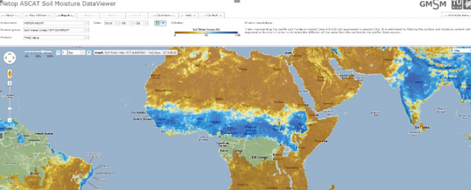 Description:This viewer allows you to display soil moisture data derived from Advanced Scatterometer (ASCAT) backscatter measurements. The three basic data types shown in the viewer are: 1) surface soil moisture data generated by EUMETSAT (most recent observations) and TU Wien (historic data) within the framework of the H-SAF project, 2) Soil Water Index (SWI) data generated by TU Wien within the framework of the Copernicus/GMES Global Land Service, and 3) Error estimates and model parameters for deriving the ASCAT soil moisture data.