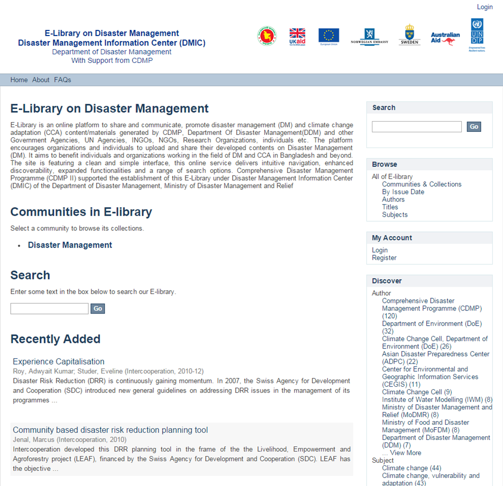 The e-library stores and shares materials useful to disaster management practitioners, Government Agencies, development partners, academicians, researchers and students, media, individuals and organisations involved in disaster management. The content is grouped into different thematic areas such as disaster risk management, climate change, vulnerability & adaptation, seismic & earthquake risk, rural and urban risk reduction and different tools and approaches. The materials mostly focus on local level disaster impacts and risk assessments, risk reduction action plans and adaptation. In addition, some national level knowledge products (e.g. impact studies an policy oriented publications) are also available. The available material, including study reports, manuals, tools, maps and hazard plans for Bangladesh, was generated by CDMP, the Department Of Disaster Management and other Government agencies, UN agencies, INGOs, NGOs, research organisations, and individuals.