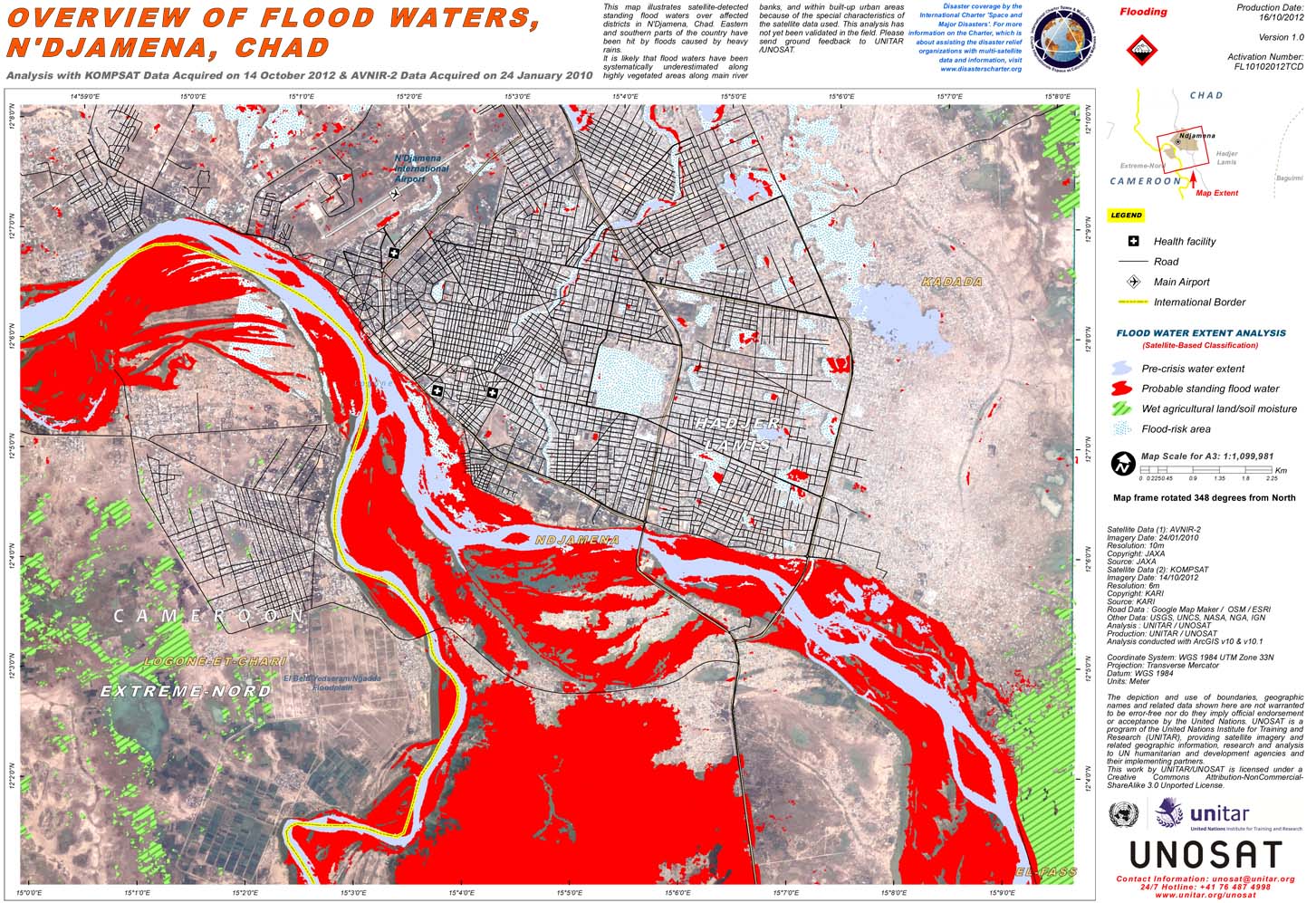UN-SPIDER, upon the request of its National Focal Point in Cameroon, requested support through its network to acquire satellite imagery of the Kousseri area, Logone et Chari district, in the far North of Cameroon. The region is experiencing serious floods leaving tens of thousands of people homeless and causing heavy damages. UN-SPIDER and its partners were able to extend a previous activation of the International Charter "Space and Major Disasters" to provide satellite imagery to this region as well. The Charter had been activated on 10 October 2012 by UNITAR/UNOSAT on behalf of UNICEF for floods in neighboring Chad. UNITAR/UNOSAT which also took the role of the Project Manager for this activation agreed to support the request. The UNOSAT map products are available on UNITAR's website [1]. [1] http://www.unitar.org/unosat/maps/TCD