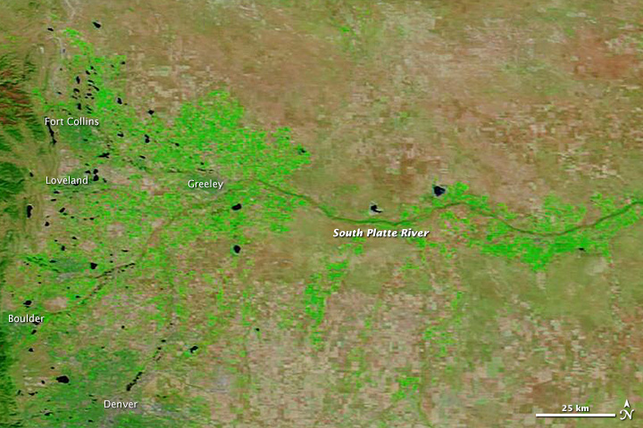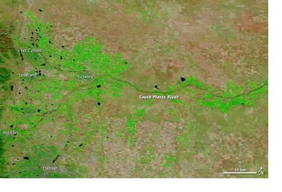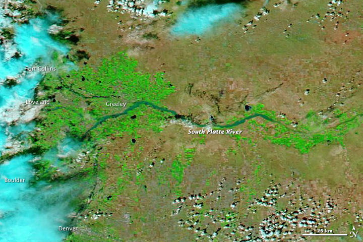 NASA explains: "The images were made from infrared light to increase the contrast between water and land. Water is typically black or dark blue in these images, but here the sediment-laden water and muddy ground are light blue. (In the true-color version, the muddy river blends with the brown landscape that surrounds it.) Irrigated farmland is bright green, while natural vegetation and bare ground are pale green and tan, respectively. Bright blue and white clouds still cover cities along the front of the Rocky Mountains, including Denver, Boulder, Loveland, and Fort Collins."