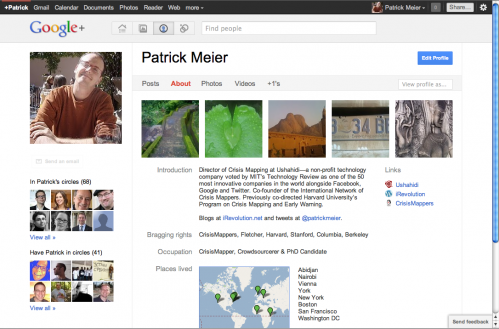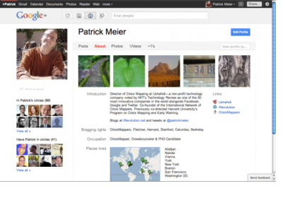 Facebook is increasingly used to crowdsource crisis information and response, as is Twitter. So is it just a matter of time until we see similar use cases with Google+? Another question I have is whether such uses cases will simply reflect more of the same or whether we’ll see new, unexpected applications and dynamics? Of course, it may be premature to entertain the role that Google+ might play in disaster response just days after it’s private beta launch, but the company seems fully committed to making this new venture succeed. Entertain-ing how Google+ (G+) might be used as a humanitarian technology thus seems worthwhile.