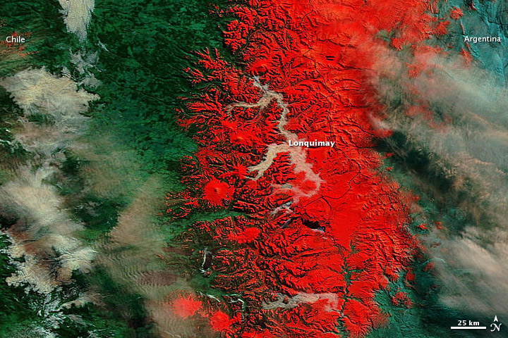 The Moderate Resolution Imaging Spectroradiometer (MODIS) on NASA’s Terra satellite captured images of the region around Lonquimay on July 22, 2011 (shown image), and July 8, 2011.