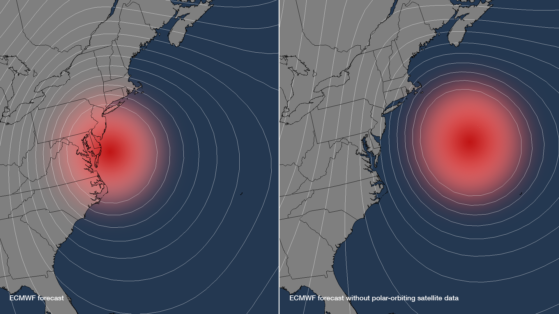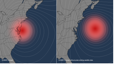 According to a new study by the European Centre for Medium-Range Weather Forecasts (ECMWF), the NOAA forecasts of Hurricane Sandy’s track could have been hundreds of miles off without information from polar-orbiting satellites. Rather than identifying the New Jersey landfall location within 30 miles five-days before landfall, the models would have shown Sandy remaining at sea.
