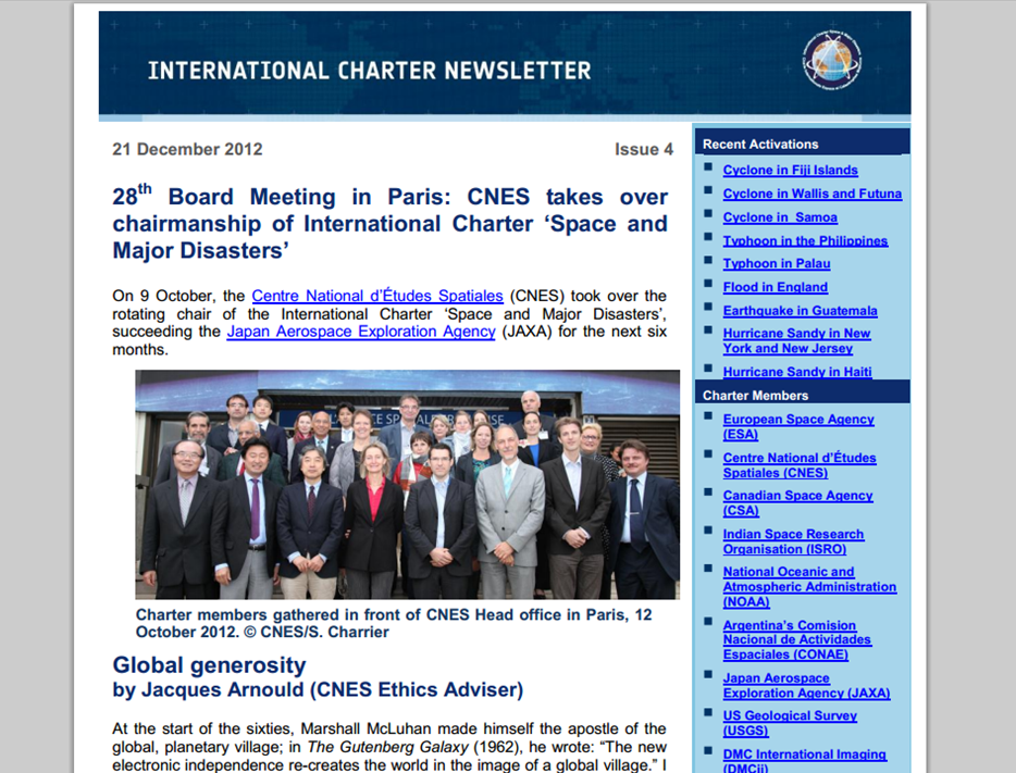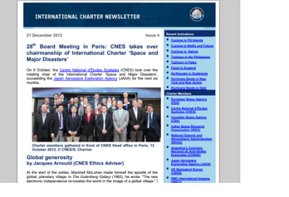 The International Charter "Space and Major Disasters" published the fourth issue of their newsletter. The publication is available online on the Charter's website and covers the following topics: