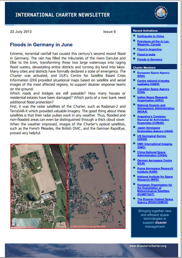 - Floods in Germany in June: The article overviews the floods suffered by Germany in June 2013 and the important role that radar and optical satellites played on the disaster management