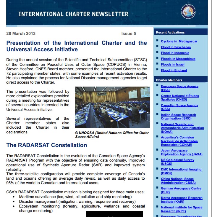 The Newsletter also touches on issues such as the RADARSAT Constellation, 2012 activation statistics and the December 2012 flooding in the UK.