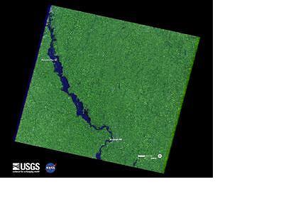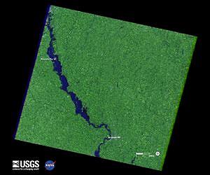 A Landsat 5 image of the area from May 5, 2011 shows normal flow. In contrast, a Landsat 7 image from July 17 depicts flood conditions in the same location.