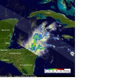 Data from TRMM's Microwave Imager (TMI) and Precipitation Radar (PR) was used to create a rainfall image from the TRMM team at NASA's Goddard Space Flight Center in Greenbelt, Md. The rainfall image showed that the future storm already was well organized and had a large area of heavy rainfall extending toward the northeast from eastern Honduras. Up until the morning hours (local time) on Monday, October 24, Honduras had a tropical storm watch in effect for its northeastern coast. That watch was dropped by 10 a.m. EDT as Rina moved away.
