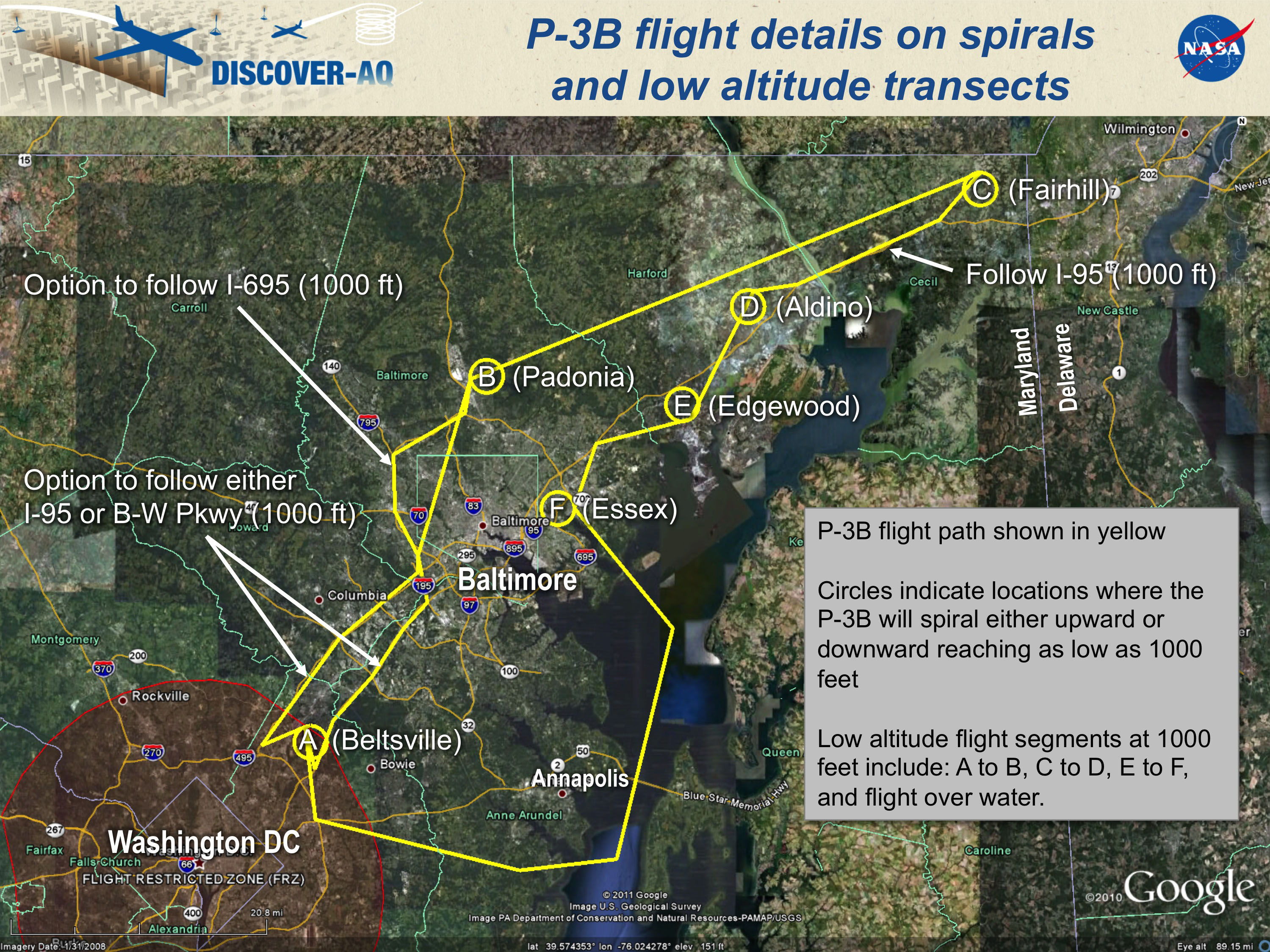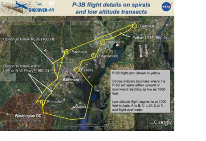 Initial test flights are planned for the week of June 27, with up to 14 science flights starting as early as July 1. The P-3B, a four-engine turboprop, will carry nine instruments. The two-engine UC-12 will carry two instruments. Sampling will focus on an area extending from Beltsville, Md., to the northeastern corner of Maryland in a pattern that follows major roadway traffic corridors. The flight path passes over six ground measurement sites operated by the Maryland Department of the Environment.