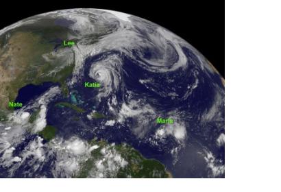Hurricane Irene lashed the East Coast of the U.S. from South Carolina to the New England states and caused record flooding in Vermont. Tropical Storm Jose lived and died in the Atlantic Ocean, only to give way to Hurricane Katia, which brought rough surf to the U.S. East Coast and did a sling-shot across the Atlantic to bring hurricane-force winds to the U.K. during the second week of September. Nate formed in the Bay of Campeche and after a couple of days made landfall in southeastern Mexico.