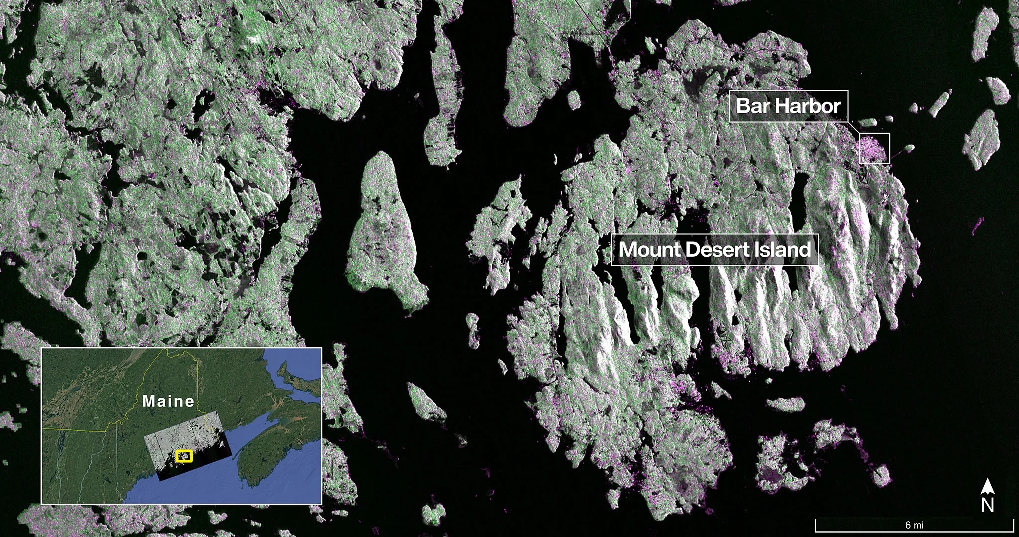 On August 21, 2025, NISAR’s L-band Synthetic Aperture Radar (SAR) system, built by NASA’s Jet Propulsion Laboratory (JPL), imaged Mount Desert Island on the coast of Maine, in which the water appears dark, forests are green, and built-up or bare surfaces are magenta. The radar’s 5-meter resolution revealed narrow waterways and offshore islets. Two days later, NISAR imaged northeastern North Dakota, capturing farmland, wetlands, and forests along the Forest River. The radar distinguished fallow fields and active cropland, with circular patterns indicating center-pivot irrigation, highlighting its potential for agricultural and land-use monitoring.