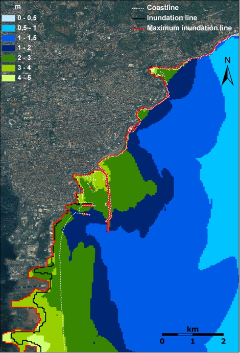 Tsunami hazard scenarios are built up by specifying the various characteristics of one or more tsunamigenic sources (possibility of earthquakes and sub-marine landslides, historical earthquakes and sub-marine landslides). Through computer simulations, the oceanic tsunami wave propagation (arrival time of first tsunami wave on land, time intervals between the various waves) and its local effects on land (extent of inundation, wave heights) can be calculated. Hence, as basic input to the generation of tsunami evacuation plans, the expected flooded areas and the expected maximum wave height in these areas will be exploited in order to define the maximum number of affected persons and the time constraints to evacuate these persons onto safe areas.
