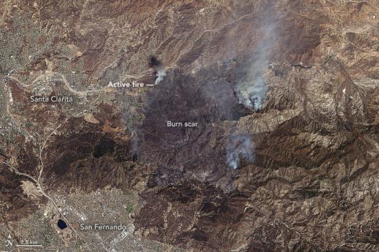 On July 25th the fire burned more than 33,100 acres displacing people from more than 10,000 homes. Dozens of buildings have been destroyed in the nearby cities of Santa Clarita and San Fernando. The sand fire left a scorch dark mark on the landscape as visible on the picture.