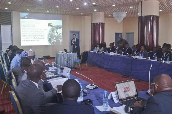 During the workshop, DCP and other national organizations delivered presentations on the use of space-based information in case of disasters in Cameroon. UN-SPIDER provided general introductions on the use of remotely-sensed data in disaster management, which included an overview of data management practices, Geographic Information Systems (GIS) and their use for mapping disaster-relevant information, and the use of such maps in disaster response. Participants were also introduced to the International Charter “Space and Major Disasters” and presented examples of maps created for addressing floods in Nigeria in 2018. Finally, the mission team demonstrated the navigation through a number of websites and portals, including the UN-SPIDER Knowledge Portal, that contain relevant analysis-ready data as well as step-by-step procedures for creating information products based on raw data. Around 50 of these websites and portals, all of which would host information relevant for disaster management efforts in the country, had been curated into a dedicated booklet that was presented to and shared with participants.