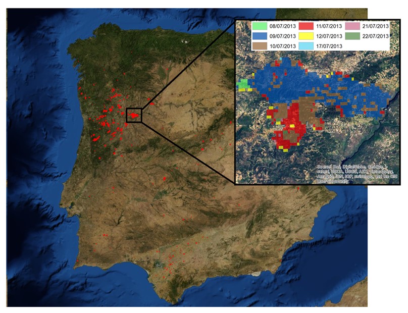 During the 2013 fire season in Portugal, remotely sensed data and satellite images were extensively used to monitor and assess the evolution of the fire, trying to anticipate the risk in some regions. Once the fires were extinguished, high-resolution satellite images were used to evaluate the impact and to develop an effective approach to avoid further damage to the environment.