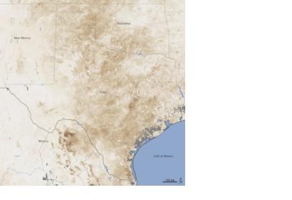 This image shows the impact of drought on plants throughout Texas, New Mexico, and Oklahoma. Made with data from the Moderate Resolution Imaging Spectroradiometer (MODIS) on the Terra satellite, the image compares plant growth between June 26 and July 11, 2011, with average conditions for the period. The image is dominated by brown, showing that plants were growing less than average throughout Texas and New Mexico.