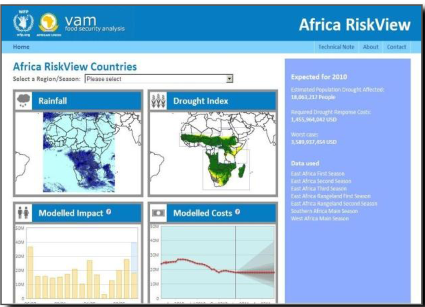 The World Food Programme (WFP) has made available an online version of the Africa RiskView software platform that aims to quantify and monitor weather-related food security risk in Africa. To date it focuses on drought, but inclusion of other weather risks is planned. Africa RiskView translates satellite-based rainfall information into near real-time impacts of drought on agricultural production and grazing. By overlaying this data with vulnerability information, the software produces a first order estimation of the drought-affected population and, in turn response cost estimates. Through this process, Africa RiskView combines four well-established disciplines: crop monitoring and early warning; vulnerability assessment and mapping; humanitarian operational response; and, financial planning and risk management.