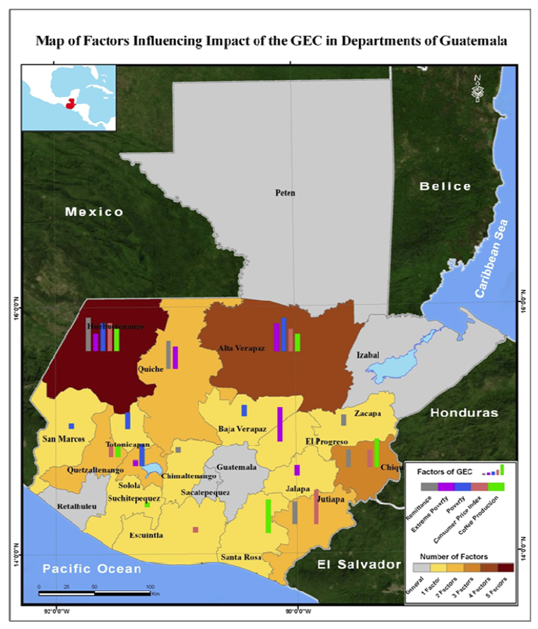 The main difficulty faced in the case of Guatemala was the lack of data that did not allow the research team to conduct a more precise assessment of the impacts of the GEC. While manifestations of the GEC were identified in developed countries and within the public sector of Guatemala, its impacts could not be readily detected through data and information generated by the government and other organizations, in particular due to the fact that the main factors affected by the GEC, such as unemployment and reduction in income at the local level in urban and rural communities associated with remittances from developed countries are not monitored on a monthly basis or a yearly basis. Poverty has been assessed only recently in 2002 and in 2006 and hence, there was no data on poverty which could be used to track the impact of the GEC. Health data was also not really accessible on a monthly basis so as to track potential indirect impacts of the GEC. Nevertheless, a variety of data regarding population, poverty, livelihoods, consumer price index and geo-spatial information have been collected to generate an overall picture regarding which departments could be more or less affected by the GEC.